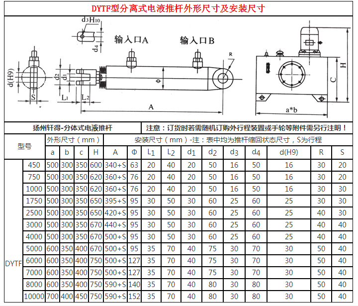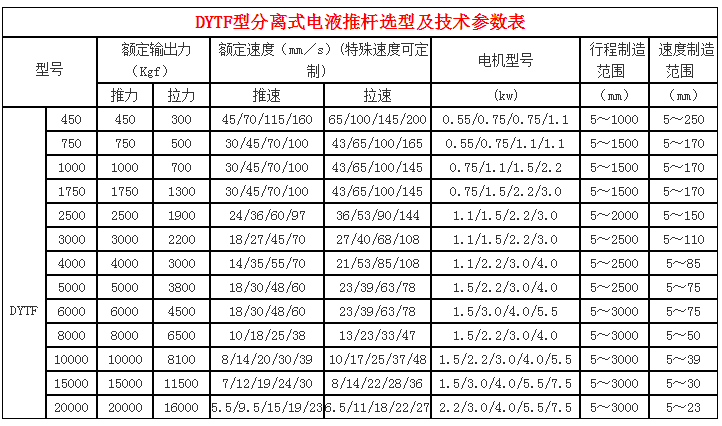 2、表中的電機型號及功率,指該推桿在額定輸出力、額定速度時為最大值的功率,電機功率與推拉力成正比。