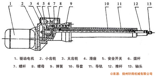 電動推桿由驅動電機、減速齒輪、螺桿、螺母、導套、推桿、滑座、彈簧、外殼及渦輪、控制開關等組成。